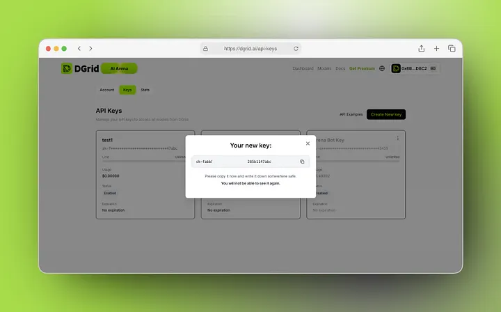 Critical Note: Never share or publicly expose your API key, as it grants access to your DGrid account and usage.