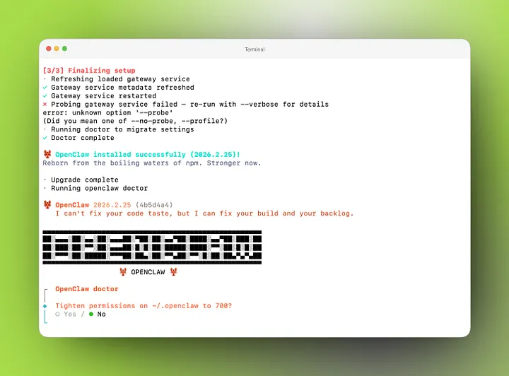 Once the installation finishes, you will see a success message in your terminal/PowerShell confirming OpenClaw is installed on your system.