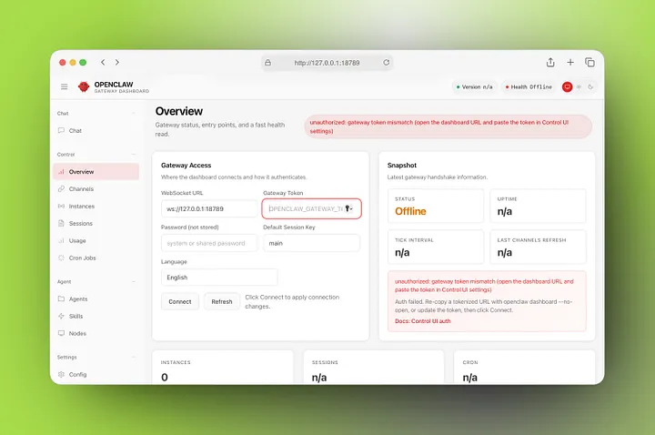 openclaw statusin your terminal to check - Verify you are using the correct gateway auth token (re-generate with