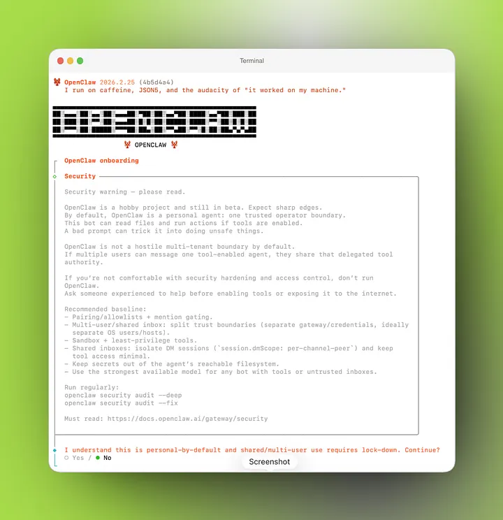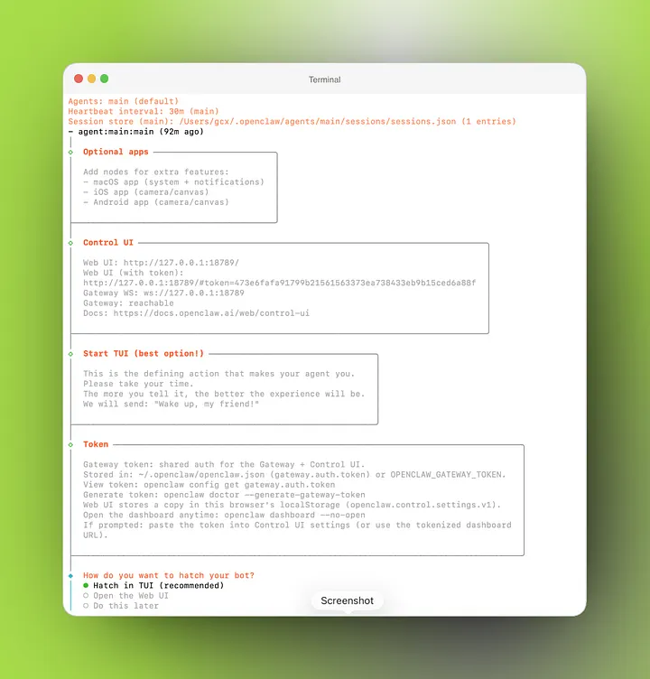 - The onboarding wizard will launch in your terminal. Follow these exact selections for a no-code setup:
